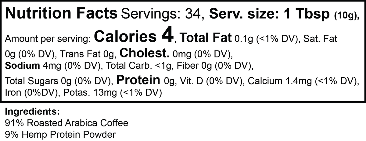 Ingredients: 91% Roasted Arabica Coffee, 9% Hemp Protein Powder